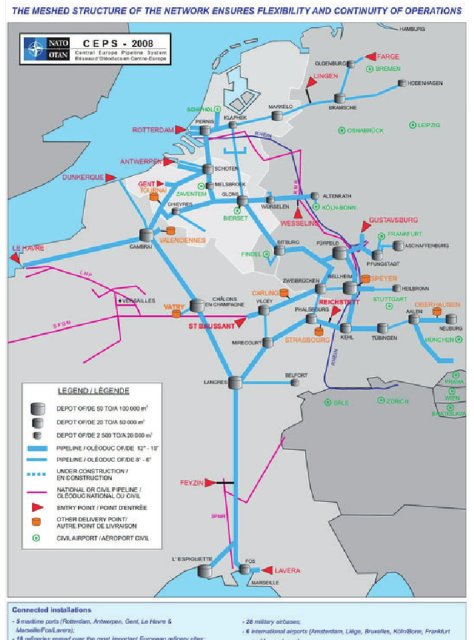 De fait, toutes ces zones de raccordement s’intègrent au Central Europe Pipeline System (CEPS), le plus important réseau d’oléoducs de l’OTAN [25] financé en 1959. Pour alimenter en carburant les véhicules des forces armées des nations centre-européennes membres de l’OTAN, il traverse la FranceTM, l’AllemagneTM, la BelgiqueTM, les Pays-BasTM, le LuxembourgTM et peut être bientôt la PologneTM et la TchéquieTM (suite à un accord préliminaire d’octobre 2025 entre l’OTAN et l’opérateur polonais de pilelines PERN) [26]. Les ports de la zone de Le Havre-Port-Jérôme et de celle de Fos-sur-Mer-Marseille constituent des points de départ de ce réseau (avec Rotterdam, Anvers et Gand) pour alimenter 28 bases aériennes, six aéroports internationaux (Amsterdam, Liège, Bruxelles, Cologne, Francfort, Bâle, Zurich et Luxembourg), 34 dépôts de l’OTAN et 5 non-OTAN. Il intègre également le terminal pétrolier de Dunkerque et des liaisons avec les pipelines civils Le Havre-Paris (au départ du port du Havre-Port-Jérôme) et Donges-Melun-Metz (au départ du port de Nantes-Saint-Nazaire). Ce réseau alimente pour la majeure partie des activités civiles mais reste opérationnel si des forces militaires doivent s’y approvisionner pour leurs opérations. D’autres raffineries et terminaux méthaniers sont fermées dans ces zones, mais peuvent redémarrer si la conjoncture économique et militaire le demande [27]. Ce réseau de pipelines de l’OTAN, d’un diamètre de 15 à 30cm, a été attaqué plusieurs fois dans les années 1980 dans le cadre d’actions revendiquées par des groupes communistes [28].