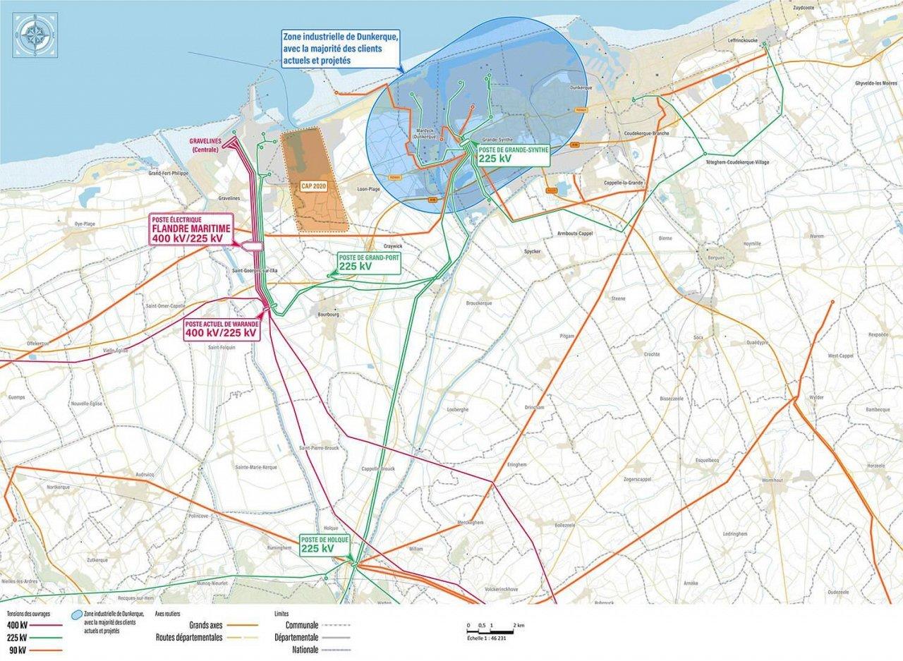 En ce qui concerne la zone de Dunkerque, un nouveau poste-source THT nommé « Flandres Maritime » est en cours de construction depuis 2024 sur la commune de Saint-George-sur-l’Aa, pour remplacer à l’horizon 2030 (au bout d’une mise en service partielle prévue mi-2026) celui de Warande (situé à Bourbourg). Il doit diffuser dans le réseau l’énergie produite par les réacteurs nucléaires de Gravelines (la plus grande centrale de FranceTM) et sans doute du parc éolien en mer de Dunkerque (d’une capacité de 600MW et dont l’atterrage se trouve entre Grande-Synthe et Loon Plage). D’une superficie de 24 hectares et comptant 21 départs 400 000 volts, 12 départs 225 000 volts et 3 départs 90 000 volts, ce poste serait le « maillon essentiel de la colonne vertébrale électrique du territoire ». Il serait ensuite question de créer le poste électrique du Puythouck sur 16,5 hectares et de le raccorder par la création de trois liaisons souterraines à double circuit 225 000 volts aux cellules aériennes existantes de celui Grande-Synthe (qui transforme en 225 000 pour alimenter le grand port). Ces deux postes de Flandres Maritime et du Puythouck seront ensuite reliés par deux liaisons à double circuit 400 000 volts sur environ 10,5km afin de donner plus de résilience au réseau. Des restructurations du réseau électrique local à 225 000 volts (constitué aux abords du port par les postes de Grand Port et de Grande-Synthe) et 90 000 volts sont également envisagées par la création de liaisons souterraines aux abords des postes de Puythouck et Flandres Maritime pour démonter des lignes aériennes existantes. Une ligne THT doit également être construite d’ici 2030 entre le poste de Navarre (près de Petit Caux) en Seine Maritime et celui d’Argoeuvres (près d’Amiens) dans la Somme pour créer un axe de mutualisation entre ces régions et l’énergie venant des centrales de Paluel et de Penly d’un côté et de celle de Gravelines de l’autre (même si en regardant sur une carte, Amiens est bien plus au sud que Gravelines).