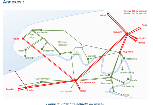 [51] : La zone est également alimentée par une liaison 225 000 volts depuis le poste de Vaupalière par deux liaisons 225 000. Les postes HTB3 (400 000) de la zone sont Havre qui doit être remplacé par Noroit, les postes HTB2 (225 000) sont Havre, Noroit, Roseaux, Marais de Radicatel, Gabion, Pont-Sept, Port-Jérôme, Ratier, Sainneville et Sandouville. Les postes HTB1 (90 000) sont Antifer, Auberville, Bleville, Charles-Laffitte, Criquet, Ecrainville, Fécamp, Gabion, Montivilliers, Pont-Sept, Port-Jérôme, Ratier, Sainneville, Saint-Jean-de-Folleville et Sandouville.