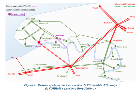 Dans la zone du Havre-Port-Jérôme, une ligne aérienne THT (400 000 volts) doit être créée sur 30km entre le poste-source de Rougemontiers (27) et celui de Havre (qui doit être par la suite remplacé par Noroit et raccourcir cette ligne THT [51]). Ensuite, une ligne souterraine de 225 000 volts doit être créée sur 20km entre les zones industrielles de Port-Jérôme et de Le Havre, c’est à dire entre les postes de Noroit et de Roseaux. Ces deux postes-sources doivent être construits pour l’occasion, le premier sur un terrain appartenant à RTE, à partir de fin 2029. La production d’énergie arrive des centrales nucléaires de Paluel (et plus tard peut être de Penly) depuis le poste de Vaupallière, et de l’autre côté de la centrale nucléaire Flamanville et du parc éolien Centre Manche 2 d’ici 2032 (d’une puissance de 1,5 GW et dont le raccordement se fait au poste de Tourbe à Bourguébus), depuis le poste de Rougemontiers (27). Les parcs éoliens en mer Fécamp Grand Large 1 et 2, envisagés à l’horizon 2035, d’une puissance de 2GW chacun, doivent eux directement être raccordés à cette zone par les postes de Noroit et Roseaux. De l’électricité arrive également du parc éolien en mer de Fécamp d’une capacité de 500MW jusqu’au poste de Sainneville-sur-Seine, puis par liaison souterraine de 12 km jusqu’au port du Havre (poste de Pont VII).