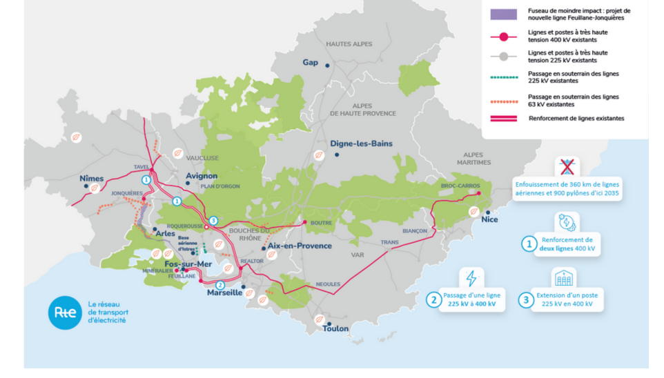 Le raccordement de la zone de Fos-sur-Mer-Marseille dépend de la création, devant aboutir en 2030, d’une ligne électrique THT (400 000 volts) aérienne à double circuit sur 65km entre les postes-sources de Jonquières-Saint-Vincent (30) et Feuillane, proche de Fos-sur-Mer (13). La structure du réseau électrique dans la zone du Golfe de Fos s’articule autour d’un axe 400 000 volts reliant la vallée du Rhône à la Provence, composé des postes électriques de Tavel (Drôme) et de Réaltor (Bouches-du-Rhône) et d’une architecture plus générale de 225 000 volts qui dessert le littoral (composée autour de la zone industrielle par Darse, Feuillane et Lavéra). Sans ce renforcement du poste HT (225 000 volts) de Feuillane depuis Jonquières-Saint-Vincent, celui-ci ne serait supporté que depuis le poste-source Réaltor, relié au poste-source de Tavel d’où l’énergie de la centrale nucléaire de Tricastin semble rentrer dans le réseau. Entre 2026 et 2030, en plus du poste de Feuillane, le plus proche de la zone industrielle, doit être créé celui de Roquerousse d’une capacité de 400 000 volts, renforçant l’axe 400 000 volts Réaltor-Ponteau-Feuillane. Notons tout de même que même avec la création de cette ligne THT depuis Jonquières-Saint-Vincent, c’est toujours depuis le poste-source de Tavel que l’énergie provient, bien qu’un parc éolien flottant doit se raccorder directement au poste de Feuillane. Le poste de Feuillane doit être alimenté par les parcs offshore de la zone de Fos sur Mer (d’une capacité de 750MW à d’ici 2031-2035). RTE prévoit également le raccordement de la zone de Plan de Campagne (au nord de Marseille) pour l’accueil de nouveaux projets de data-centers [53], avec un premier palier à l’horizon 2030 d’une capacité de 320 MW et d’un second à l’horizon 2032 d’une capacité totale de 550 MW. Sans ce renforcement, cette zone, particulièrement propice à l’accueil de data-centers avec l’arrivée de 16 câbles sous-marins de télécommunications, est saturée en termes d’approvisionnement électrique. Il nécessite la création du poste HT (225 000 volts) Plan de Campagne et une restructuration du poste de Réaltor, reliant le premier par la création de deux lignes souterraines 225 000 volts de 4,5km en 2030. Puis d’ici 2032, une nouvelle restructuration de ces deux postes ainsi qu’une création d’une liaison souterraine de 9,5km. La mutualisation de la large zone de Midi Provence (et des besoins de la zone de Fos sur Mer) dépend du sens de transit des flux sur l’axe La Gaudière – Tavel sachant que le sens peut aller vers les interconnexions FranceTM – EspagneTM depuis La Gaudière [54]. Selon un document de RTE, l’axe Roquerousse – Réaltor resterait un point faible de ce réseau. Semble-t-il que les 5GW supplémentaires apporté à cette large zone Midi Provence (déjà saturée), sera utilisée pour moitié par les industriels.