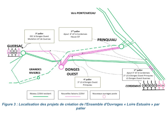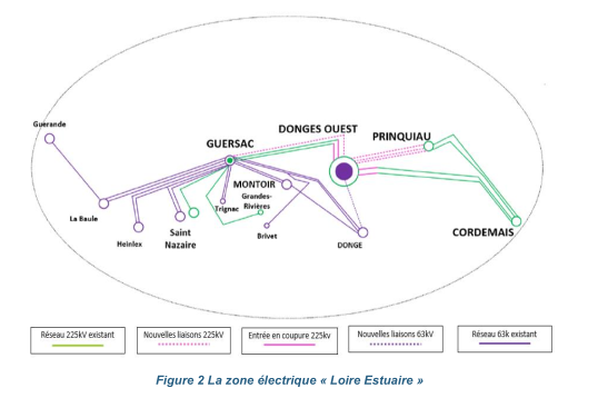 Le raccordement de la zone Nantes-Saint-Nazaire (« Loire Estuaire ») [55] dépend de la création préalable du poste « Donges Ouest » (qui doit changer de nom à l’issue de la concertation dite « Fontaine » au sujet des raccordements). En 2030, celui-ci doit être étendu avec la création d’un jeu de barres. Deux liaisons souterraines (225 000) doivent être créées entre ce poste de Donges Ouest et le poste de Prinquiau, dont l’une ferait 12 km. Une autre ligne souterraine (225 000) doit être créée entre Donges Ouest et Guersac sur 8 km. En 2030, un 5e autotransformateur du 400 000 au 225 000 Volts sur le poste de Cordemais (HTB3), puis d’un sixième en 2031 ainsi que des travaux des tronçons souterrains vers Guersac, Prinquiau, Donges Ouest… Alors que la centrale à charbon de Cordemais devait arrêter sa production en 2022, elle a été prolongée jusqu’en 2027 (et peut être plus par la suite) pour approvisionner le réseau d’1GW. Sa fermeture sera envisagée [56] lorsque d’autres approvisionnements viendront compenser son apport, notamment par la mise en service de l’EPR de Flamanville (Manche) ou avec la mise en service progressive des parcs éoliens de Saint-Nazaire et de Saint-Brieuc ou de Centre Manche 1 et de Fécamp ou la centrale à gaz de Landivisiau. Ces approvisonnements devraient arriver toujours par le poste de Cordemais ou par celui de Prinquiau.