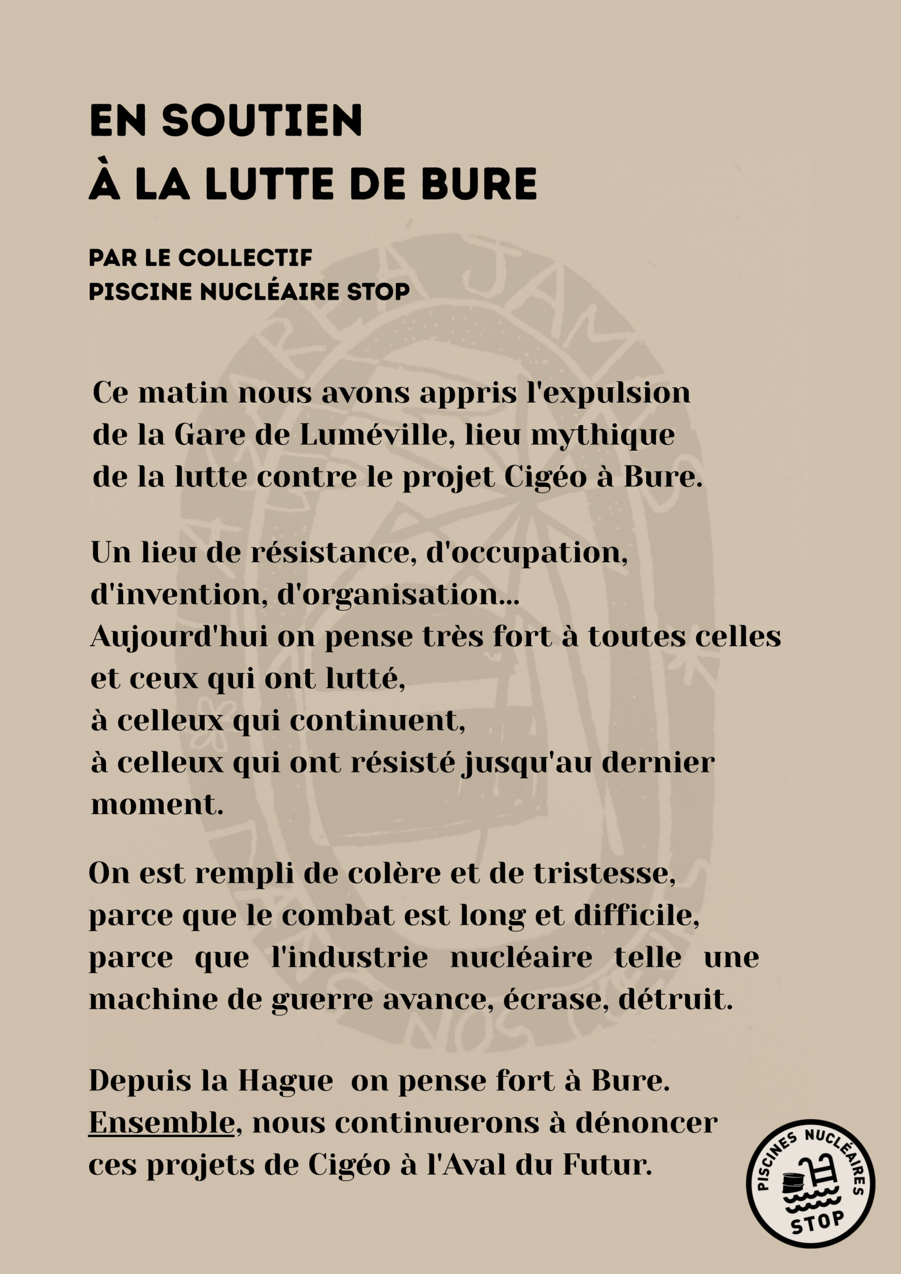 Nous souhaitons déjà remercier les différents collectifs pour leur message de soutien dont nos ami.es du collectif Piscine Nucléaire Stop. Nous publierons une compilation de tout les textes et visuels de soutien envoyé à l’adresse mail suivante : bureburebure [at] riseup [point] net. Vous pouvez également envoyer des lettres à l’adresse suivante : Maison de la résistance, 2 rue de l’Eglise 55290 Bure.