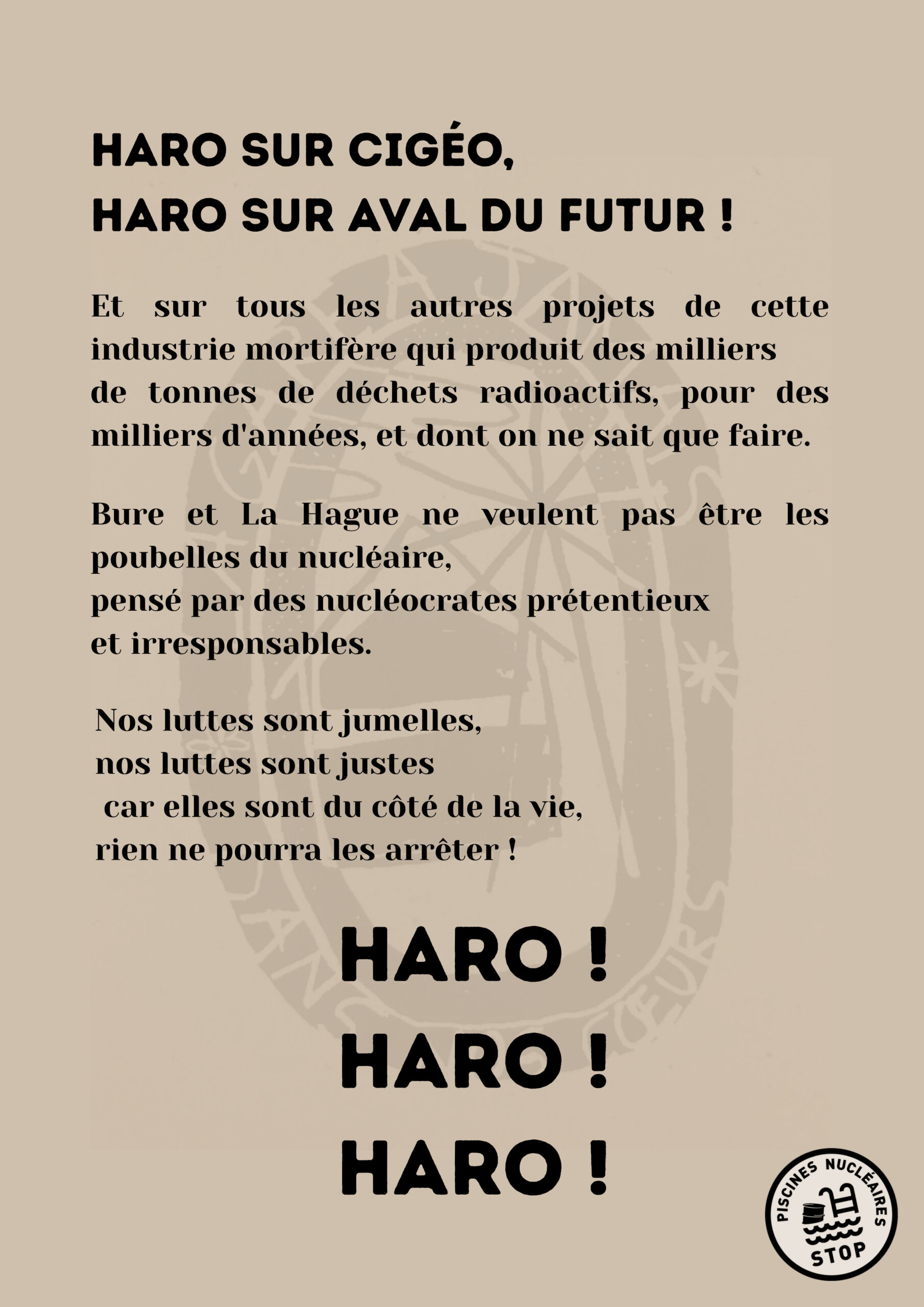 Dans ce moment particulier pour la lutte à Bure contre CIGEO où de nombreuses personnes ont perdu leur lieu de vie, tout soutien est extrêmement précieux. Alors envoyez nous des visuels de vos banderoles, tags, ou envoyez nous des lettres, textes, cartes postales, déclarations pour renforcer notre détermination collective à nous opposer à CIGEO et nous soutenir. Cela nous ferait particulièrement plaisir de voir des pensées pour la Gare dans les différents cortèges du 1er mai.