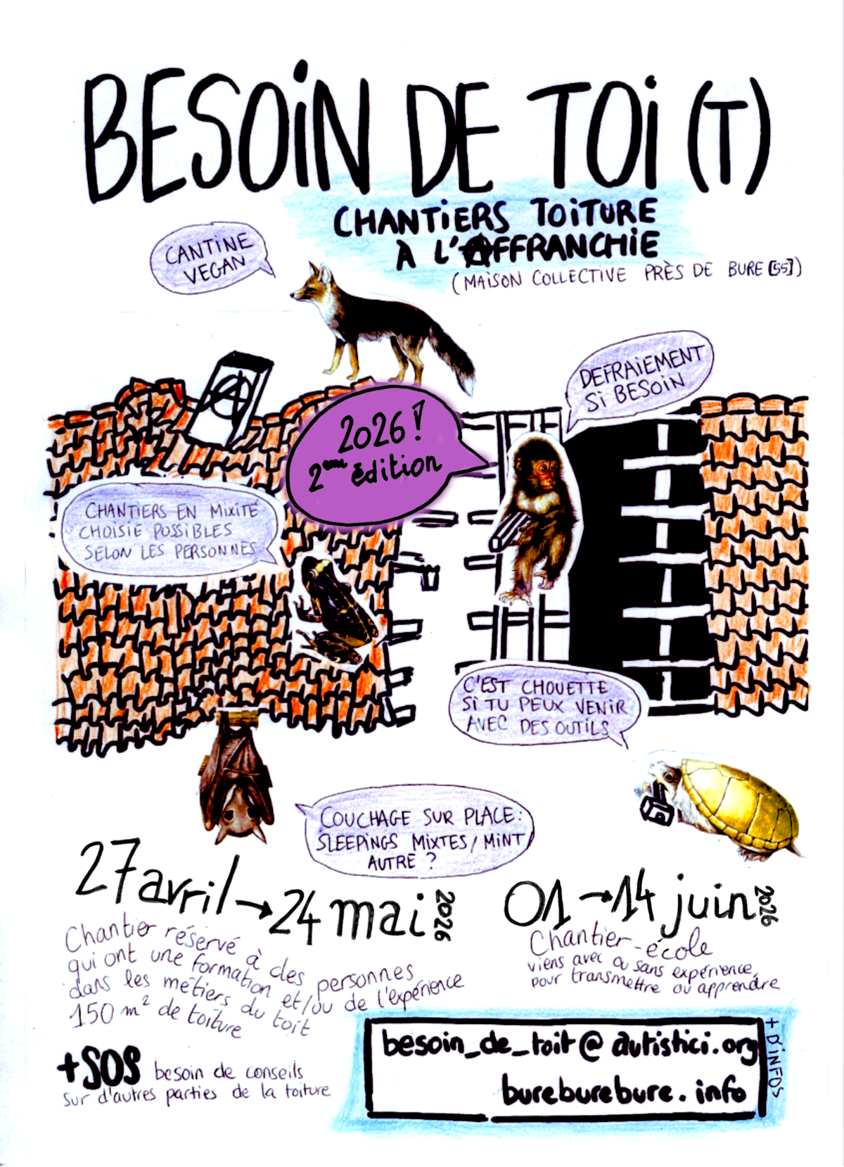 Question logistique, c’est comme d’habitude : sleepings sur place, mixités des groupes à définir sur le moment, vie quotidienne autogérée, cantine vegan, …