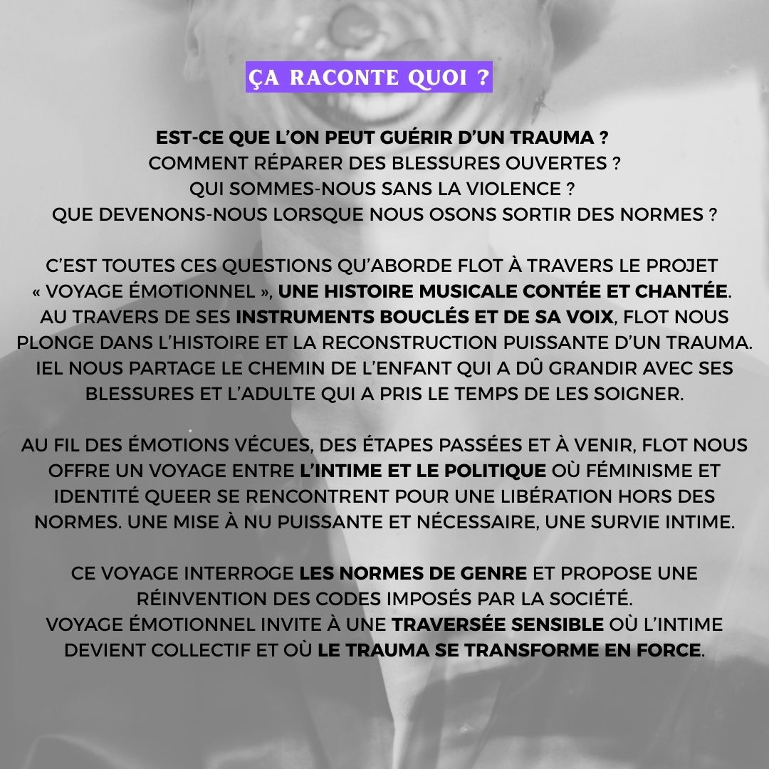 C’est toutes ces questions qu’aborde flot à travers le projet « voyage émotionnel », une histoire musicale contée et chantée. Au travers de ses instruments bouclés et de sa voix, flot nous plonge dans l’histoire et la reconstruction puissante d’un trauma. Iel nous partage le chemin de l’enfant qui a dû grandir avec ses blessures et l’adulte qui a pris le temps de les soigner.