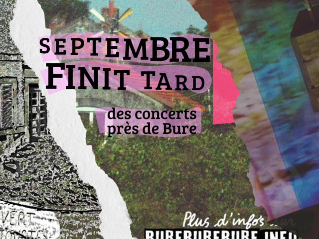 Tout au long de ce mois de septembre qui n’en finit pas de ne pas finir, des concerts auront lieu à Bure et aux alentours… SAMEDI 6 SEPTEMBRE (21h) Bichon (live breaking techno ; Nancy) 2PanH... Lire la suite
